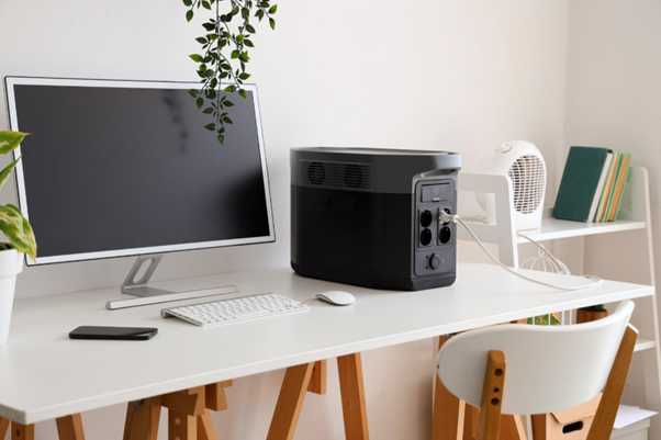 Home setup with different UPS types visible: A desktop UPS unit powering a computer workstation in a modern South African home office
